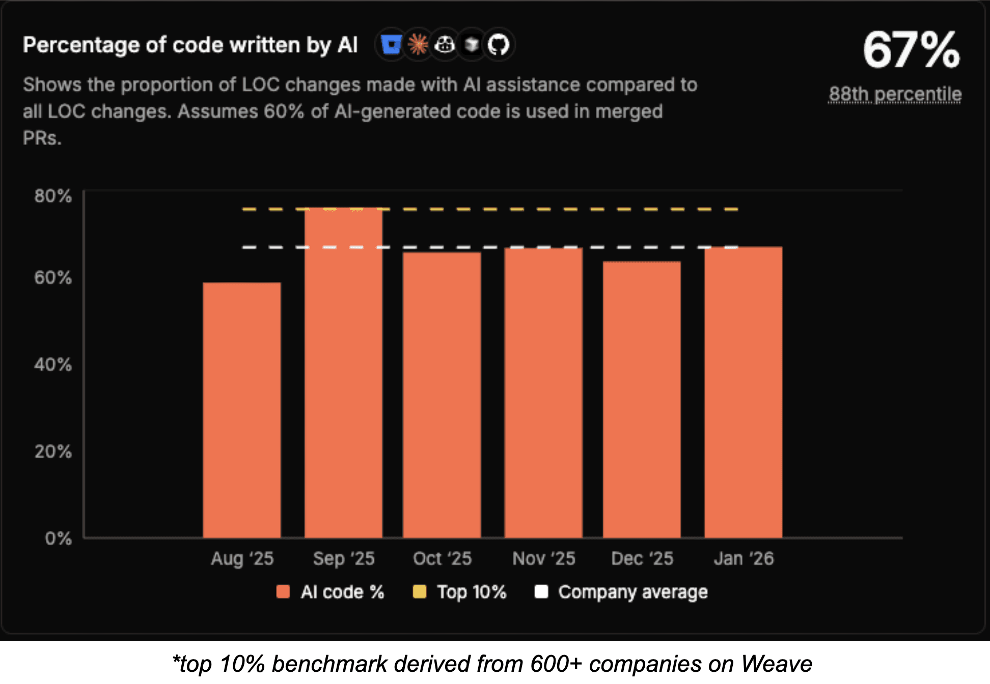 Strategic AI Adoption: The team began using Weave's component-level breakdown to understand where AI was having the most impact. They could see that backend teams were seeing dramatic productivity gains, while frontend teams were lagging behind, surfacing specific areas for improvement in their AI adoption strategy.