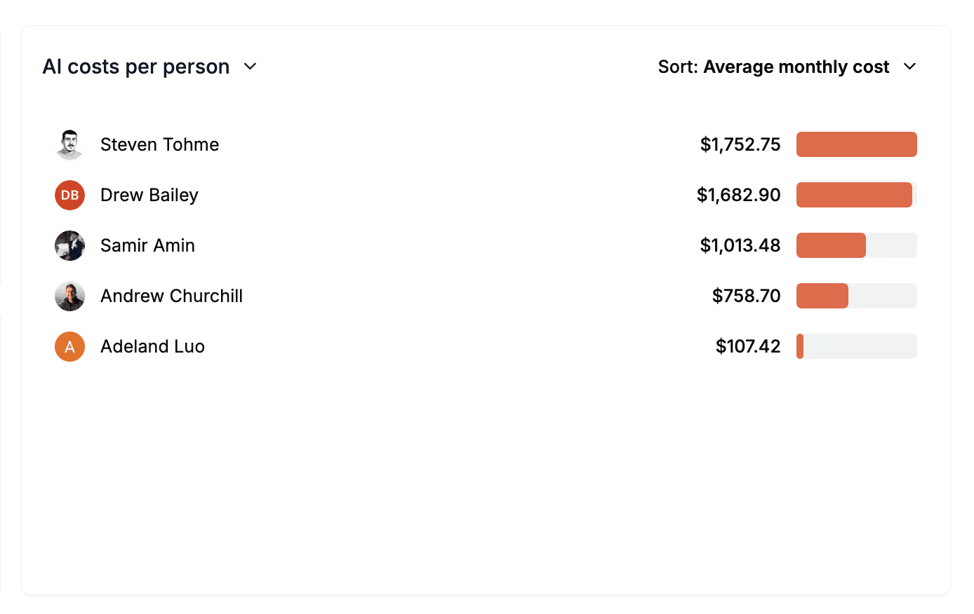 See who's actively using AI tools, which tools are most adopted, and how adoption is changing over time. Break it down by team, tool, and individual.