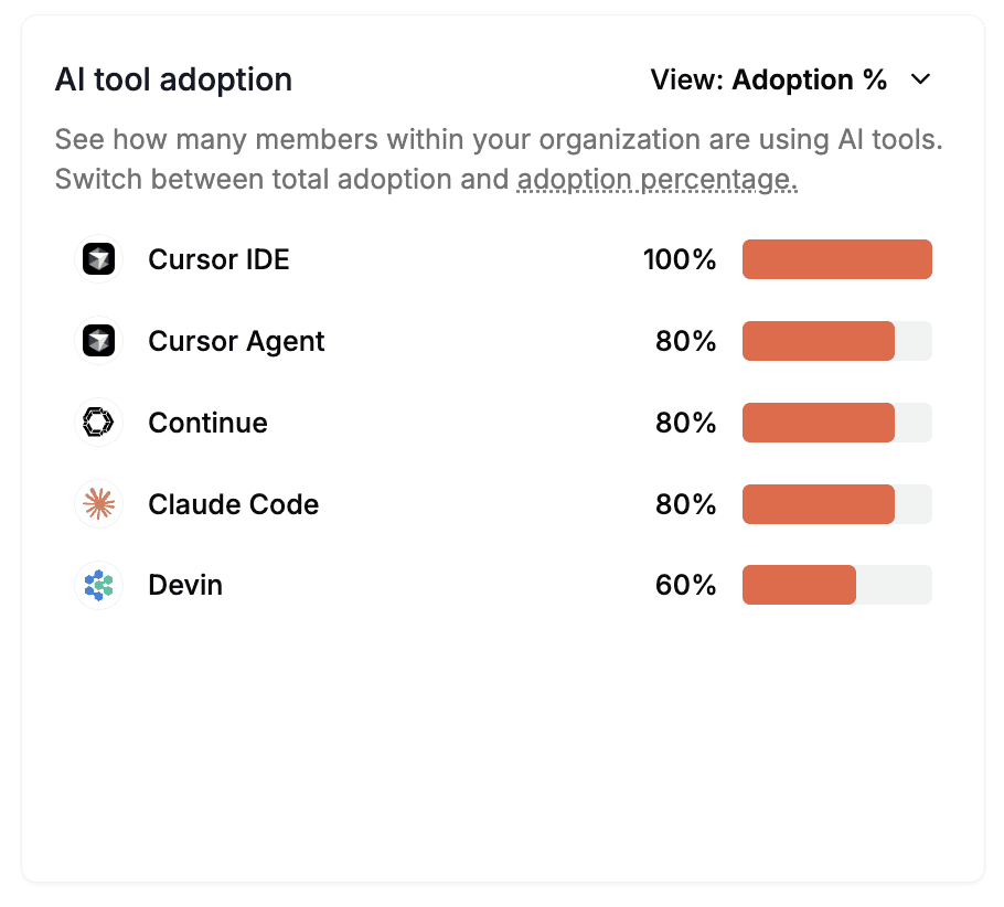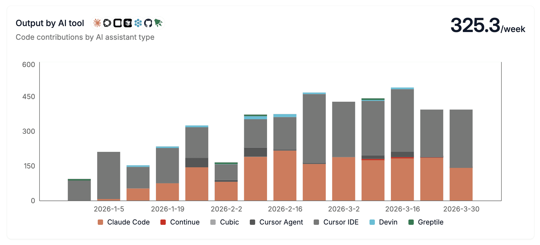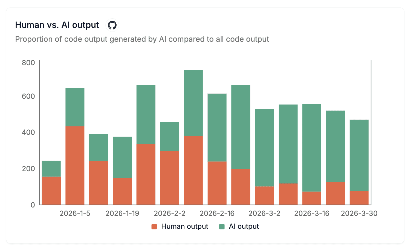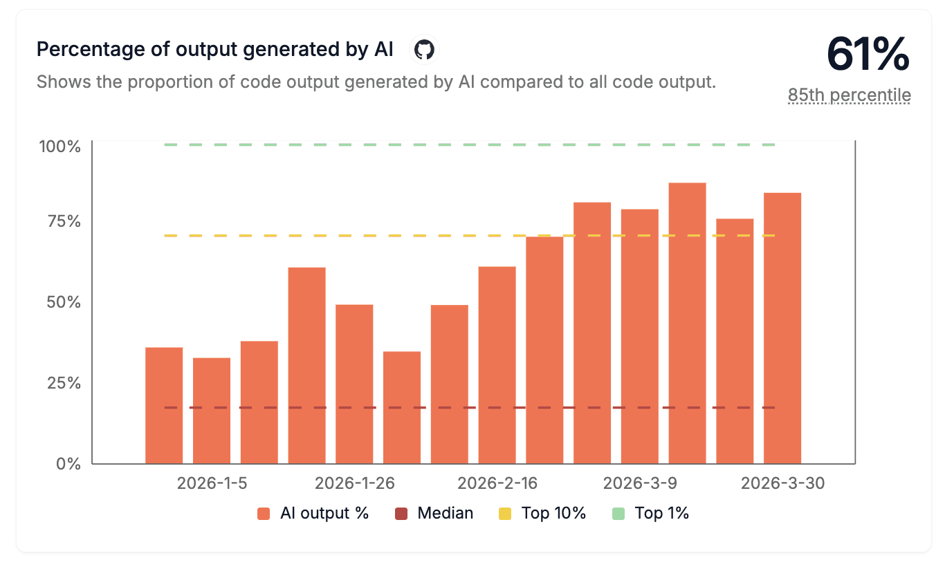See the exact portion of your codebase generated or modified by AI. Track how that percentage changes over time by team, repo, or individual.