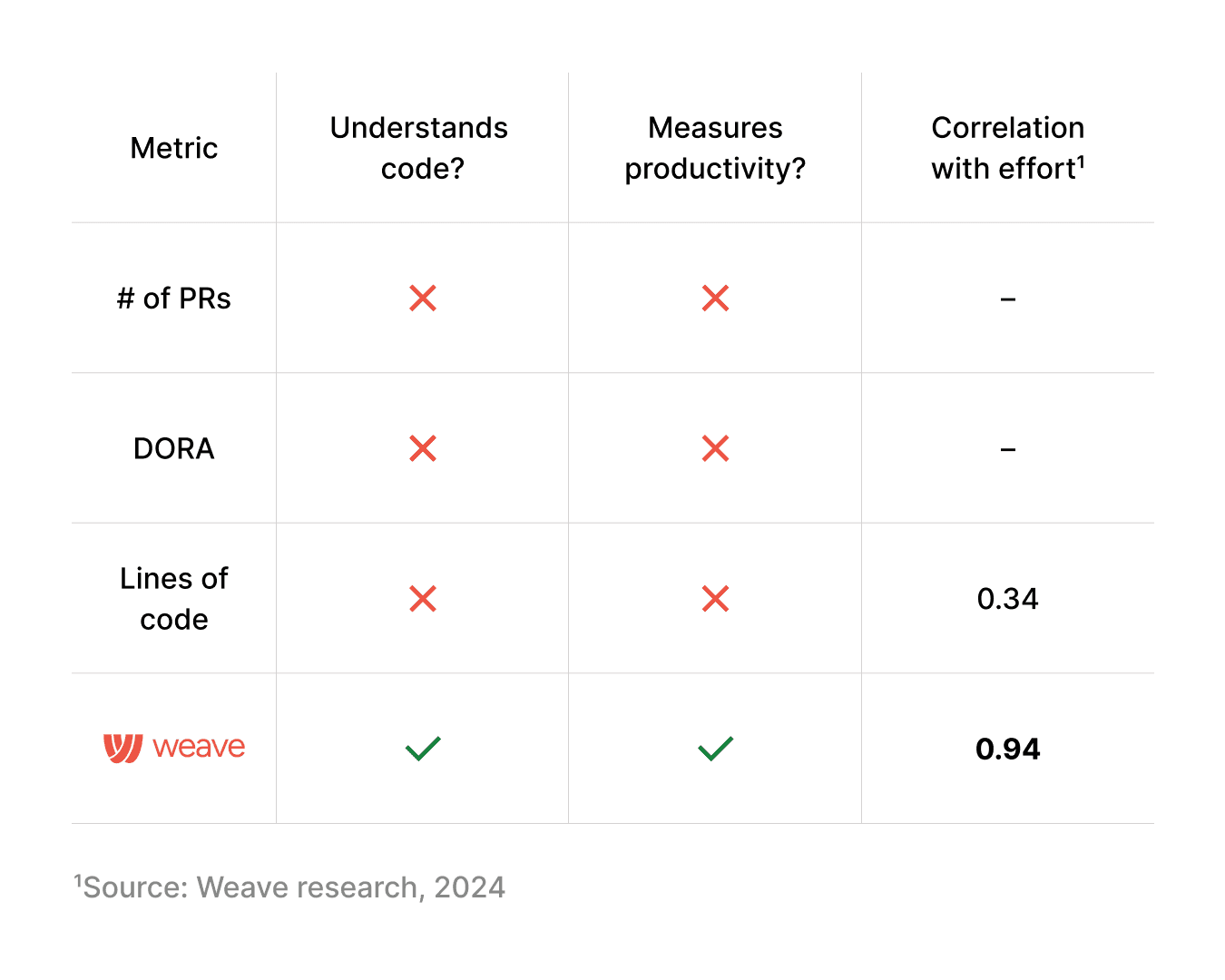 Go beyond lines of code. Weave normalizes units of work based on expert benchmarks—giving you a fair, accurate view of productivity by team or individual engineers.