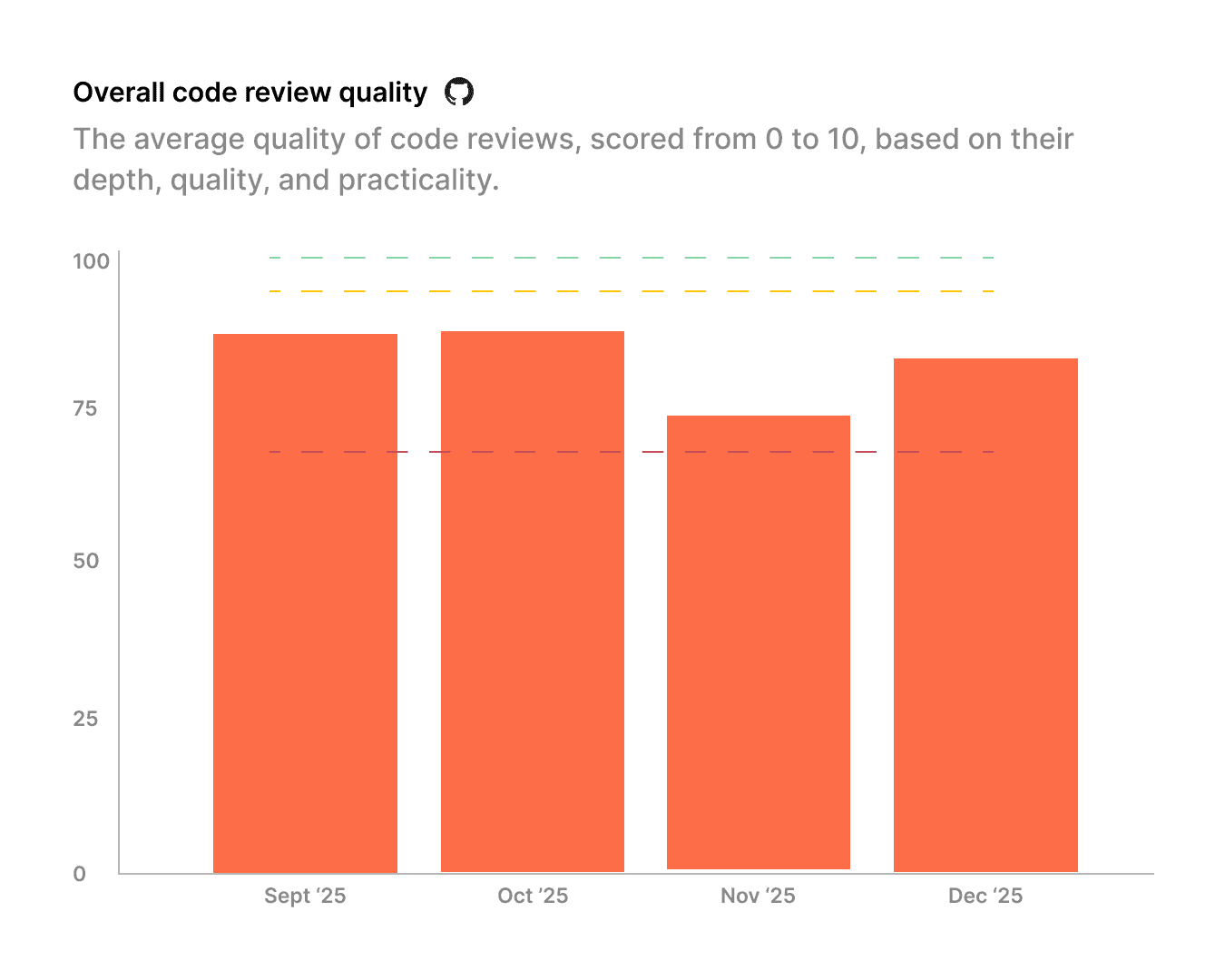 Score code review quality on depth, thoroughness, and practicality to keep your review bar high over time.