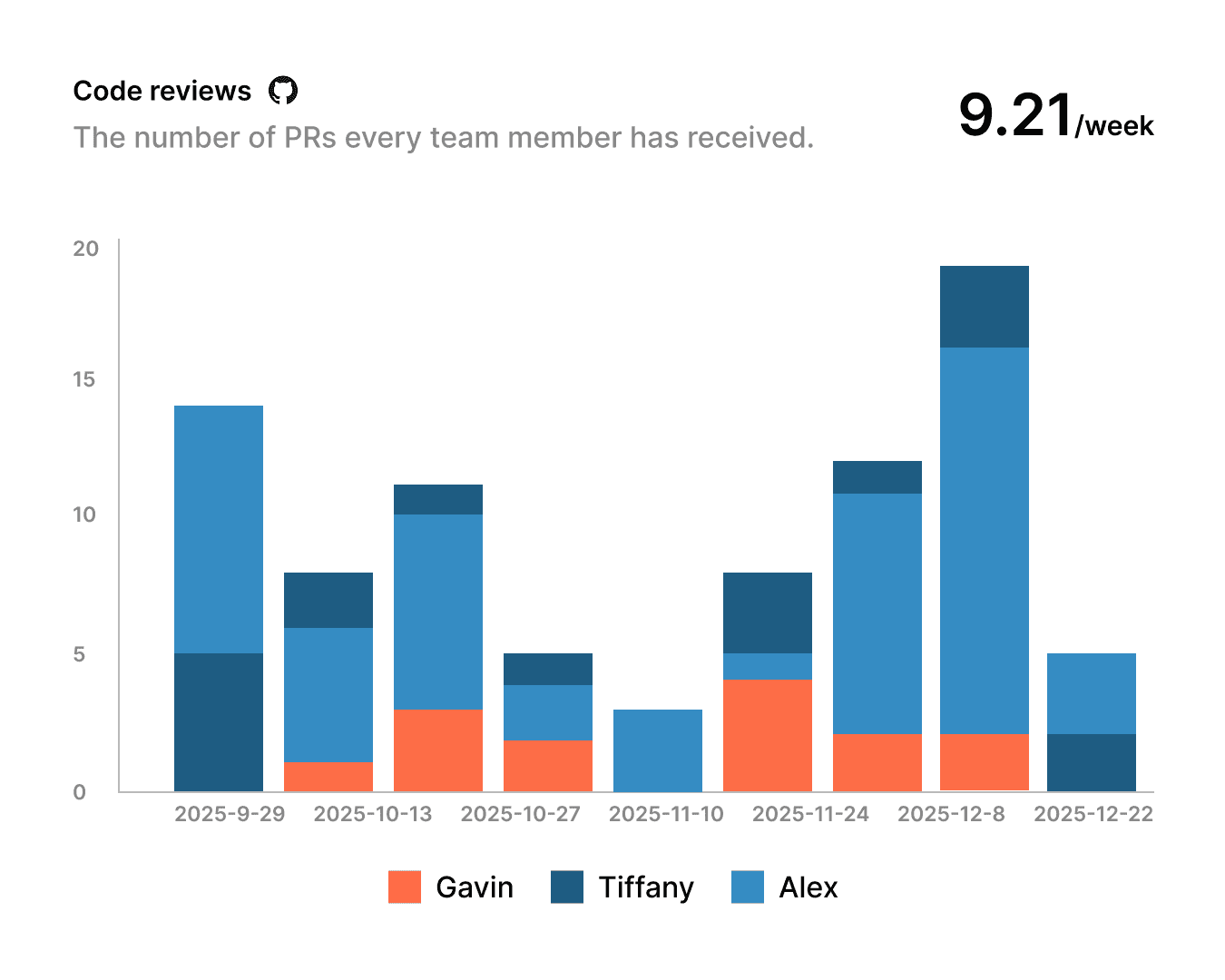 Break down review volume by team member and week to balance workload and keep reviews from piling up.