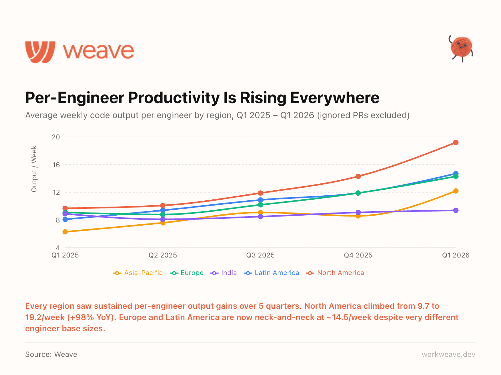 Every region saw sustained per-engineer output gains over 5 consecutive quarters. North America climbed from 9.7 to 19.2/week (+98% YoY). Europe and Latin America are now neck-and-neck at about 14.5/week despite very different engineer base sizes.