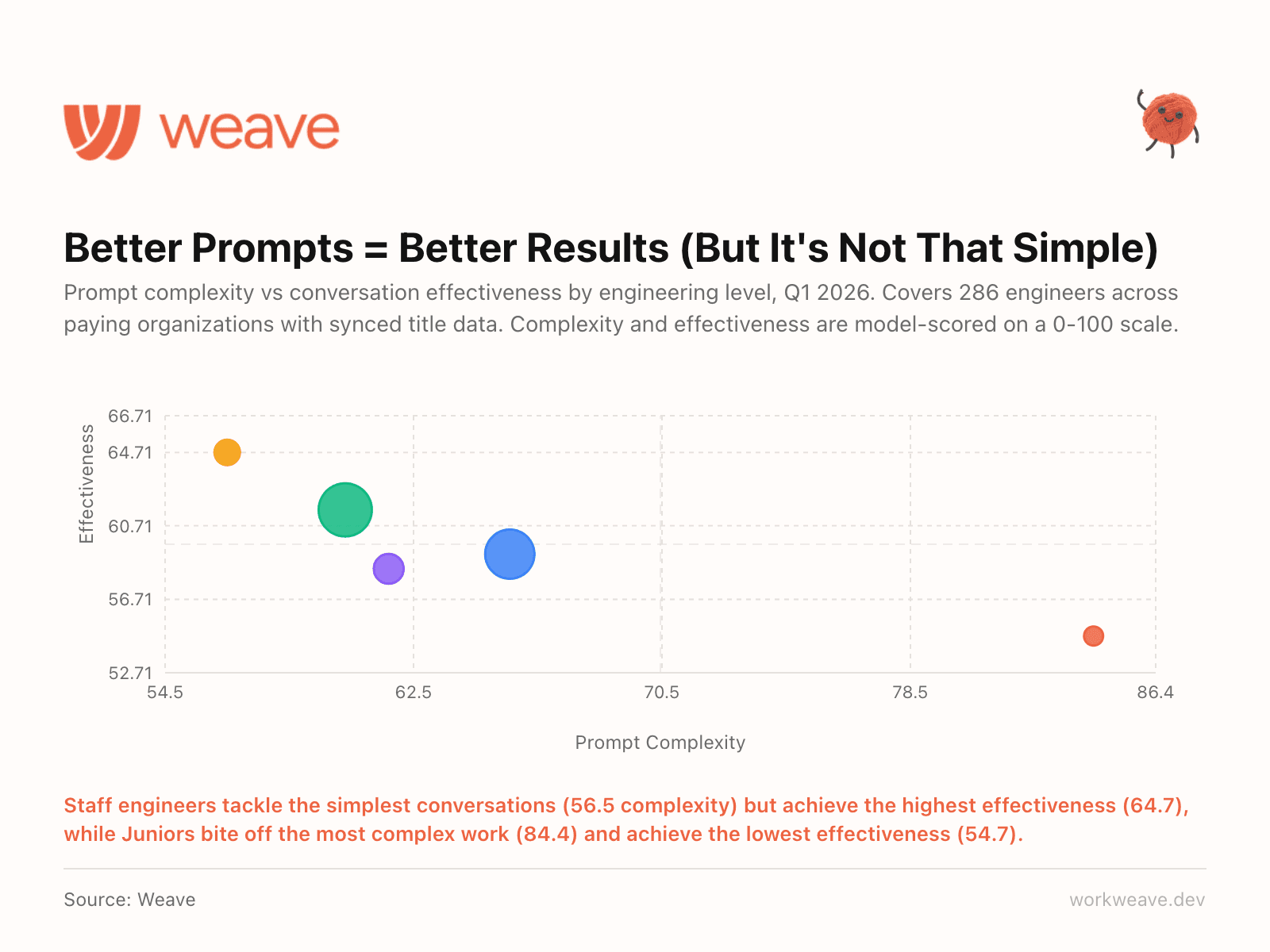 Staff engineers scored 64.7 on conversation effectiveness with an average prompt complexity of just 56.5. Juniors scored 54.7 effectiveness while tackling prompts rated 84.4 in complexity. The pattern is consistent across every seniority level: the more senior the engineer, the simpler their prompts and the better their results.