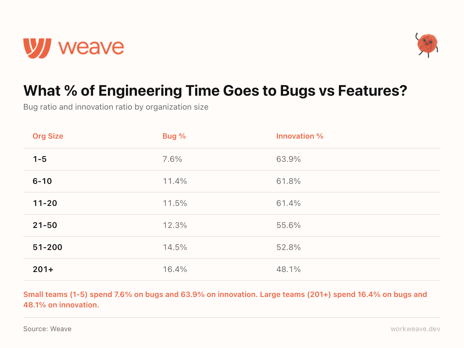 Here is how engineering output breaks down by team size: small teams (1-5) spend 7.6% on bugs and 63.9% on innovation. Large teams (201+) spend 16.4% on bugs and 48.1% on innovation.