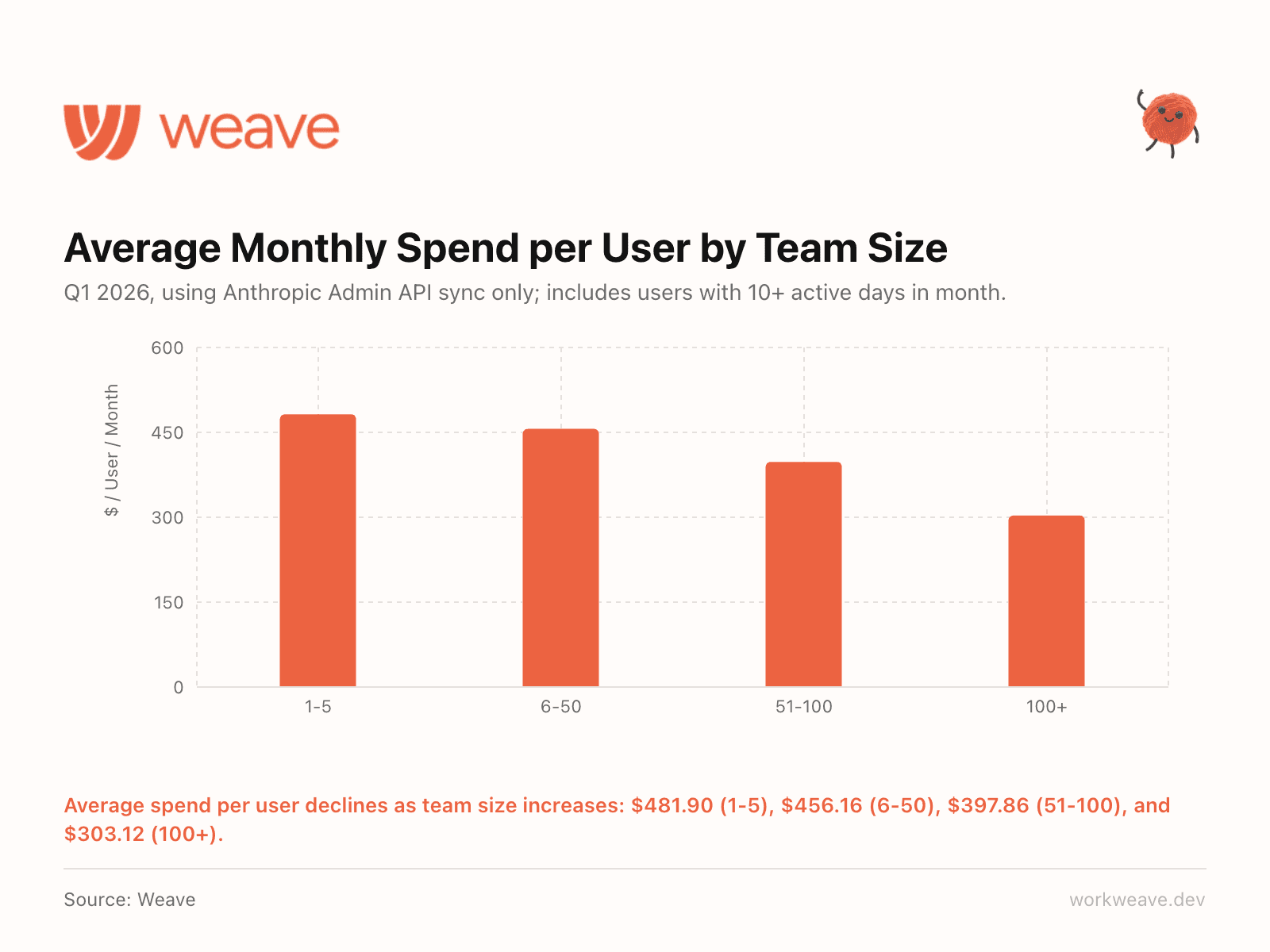 Average monthly AI spend per user declines as team size increases: $481.90 (1-5 engineers), $456.16 (6-50), $397.86 (51-100), and $303.12 (100+).