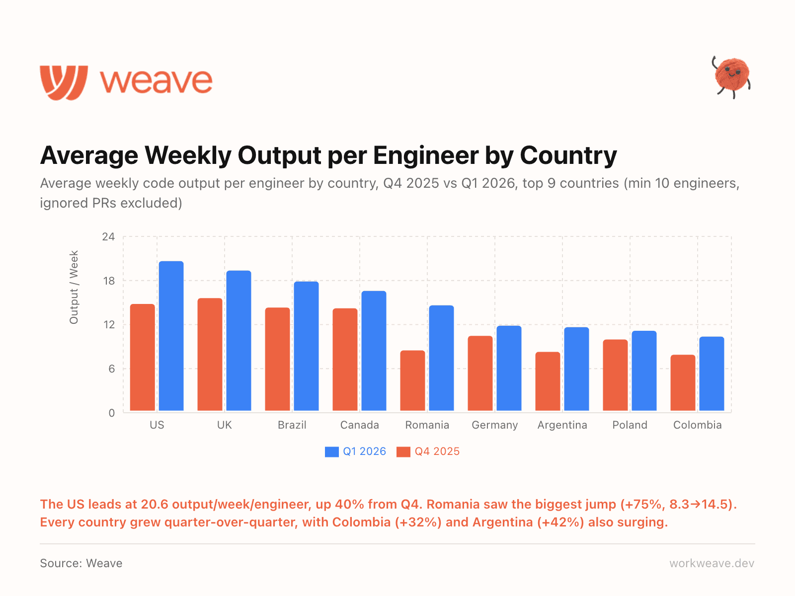 The US leads at 20.6 output/week/engineer, up 40% from Q4. But look at the growth rates elsewhere: Romania +75% (8.3 to 14.5), Argentina +42%, Colombia +32%.