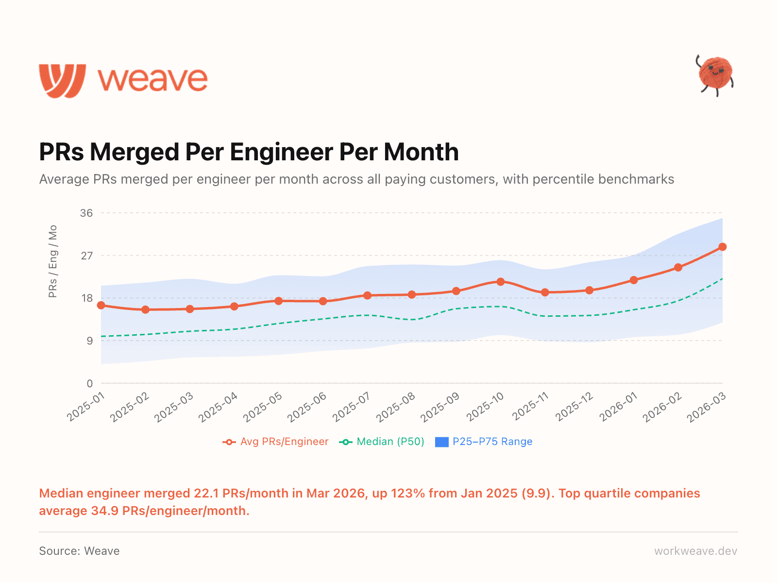 The median engineer merged 22.1 PRs/month in March 2026. In January 2025, that number was 9.9. That is a 123% increase in 14 months.