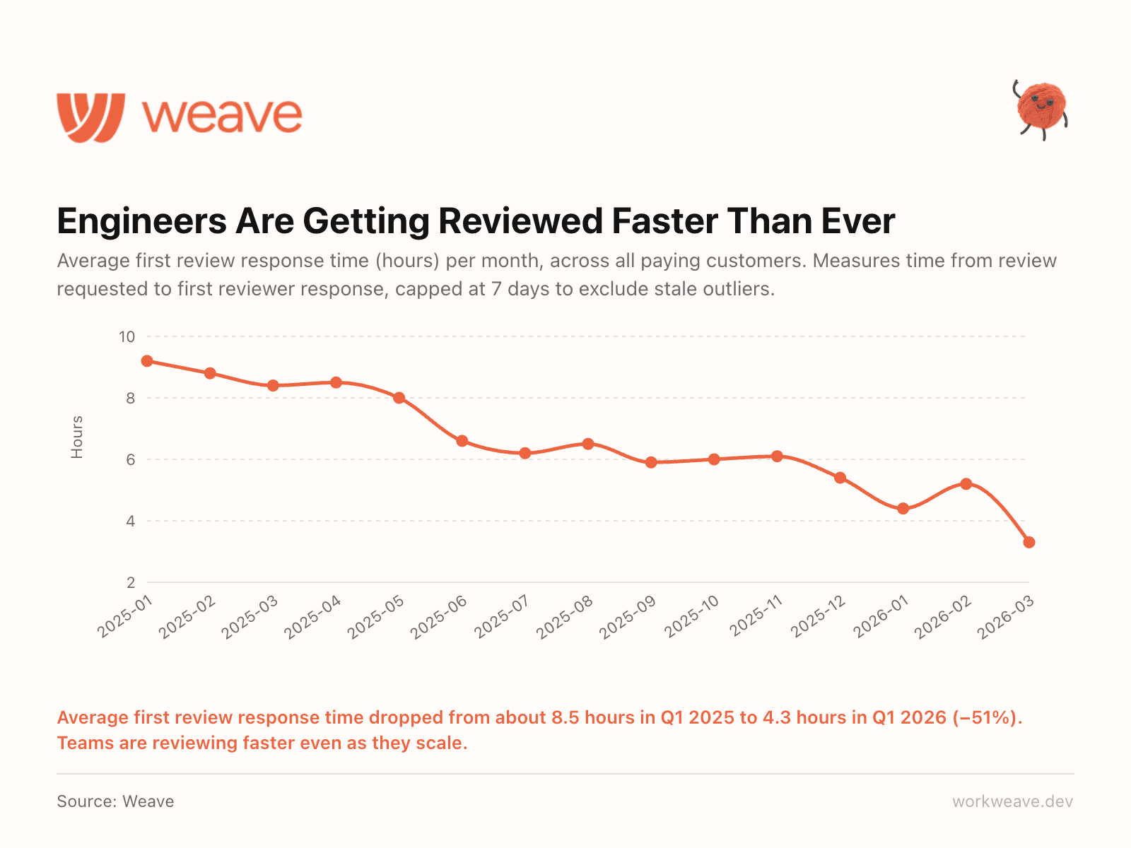 Average first review response time dropped from 8.8 hours in Q1 2025 to 4.3 hours in Q1 2026, a 51% decrease. While review request volume grew 5.4x, from 134K to 724K.