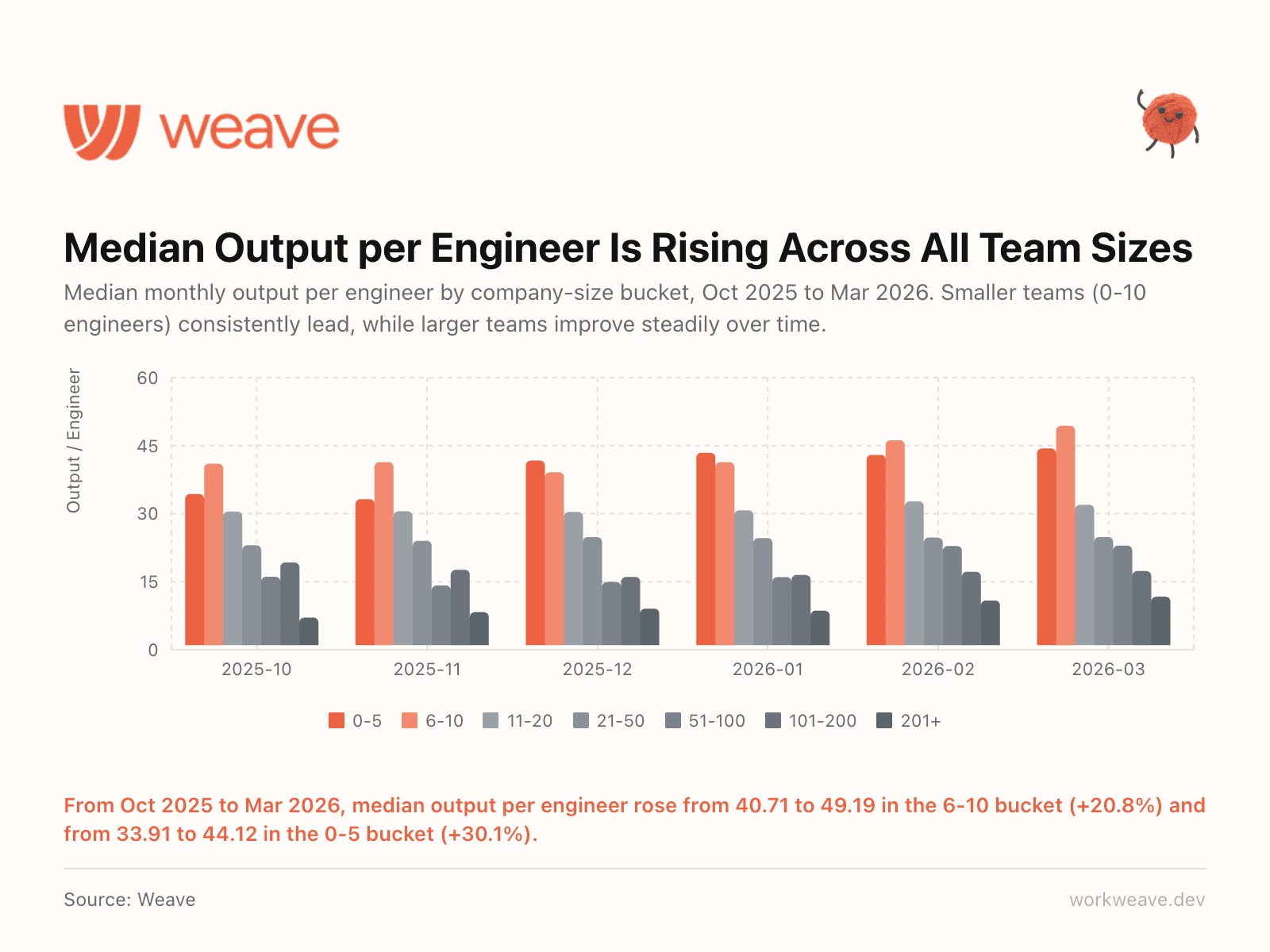 Output per engineer is rising across all team sizes. Smaller teams (0-10 engineers) consistently lead, while larger teams improve steadily. The 6-10 bucket rose 20.8% and the 0-5 bucket rose 30.1% over 6 months.