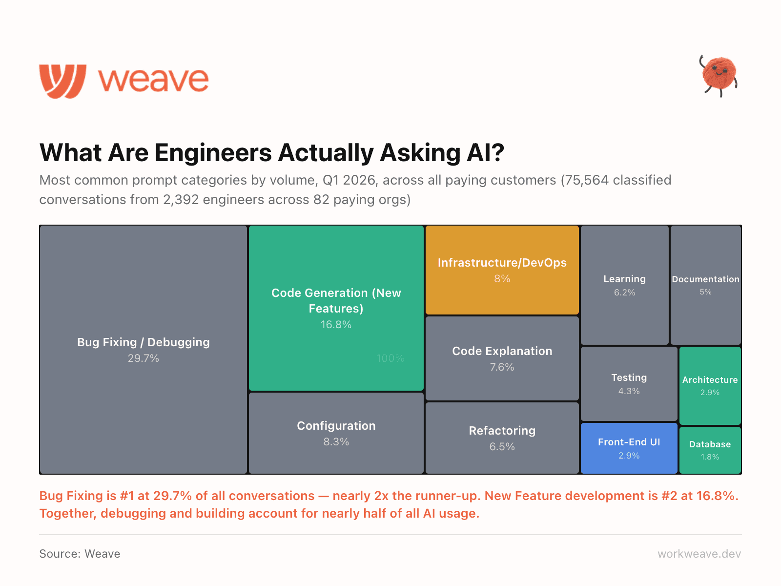 Together, debugging and building account for nearly half of all AI coding tool usage. If your AI adoption strategy is focused on code generation, you are optimizing for the wrong use case. Engineers are using AI to fix things, not just build them.