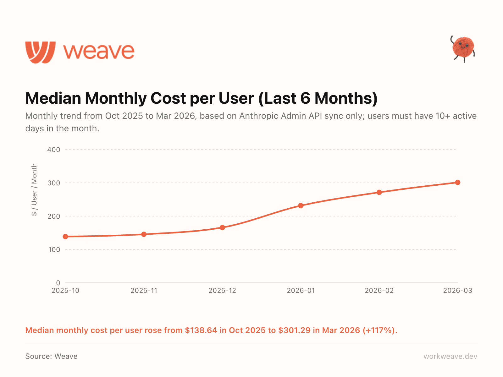 Average cost per user rose from $167.68 in October 2025 to $515.57 in March 2026, a 207% increase. The monthly median rose from $138.64 to $301.29 (+117%).