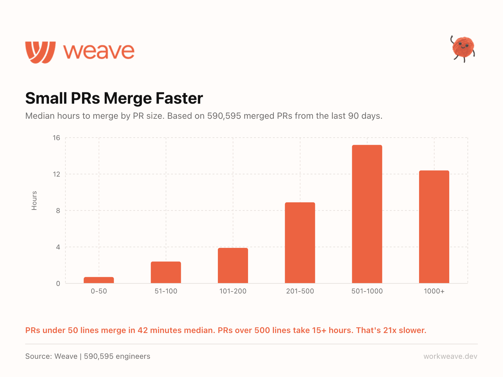 Across 590,595 merged PRs: PRs under 50 lines merge in 42 minutes median. PRs over 500 lines take 15+ hours. That is 21x slower.