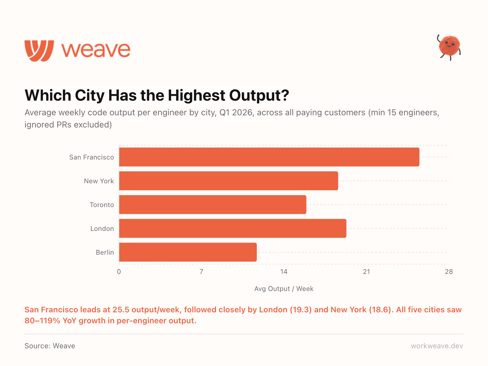 San Francisco leads at 25.5 output/week per engineer, followed closely by London (19.3) and New York (18.6). All five top cities saw 80-119% year-over-year growth in per-engineer output.