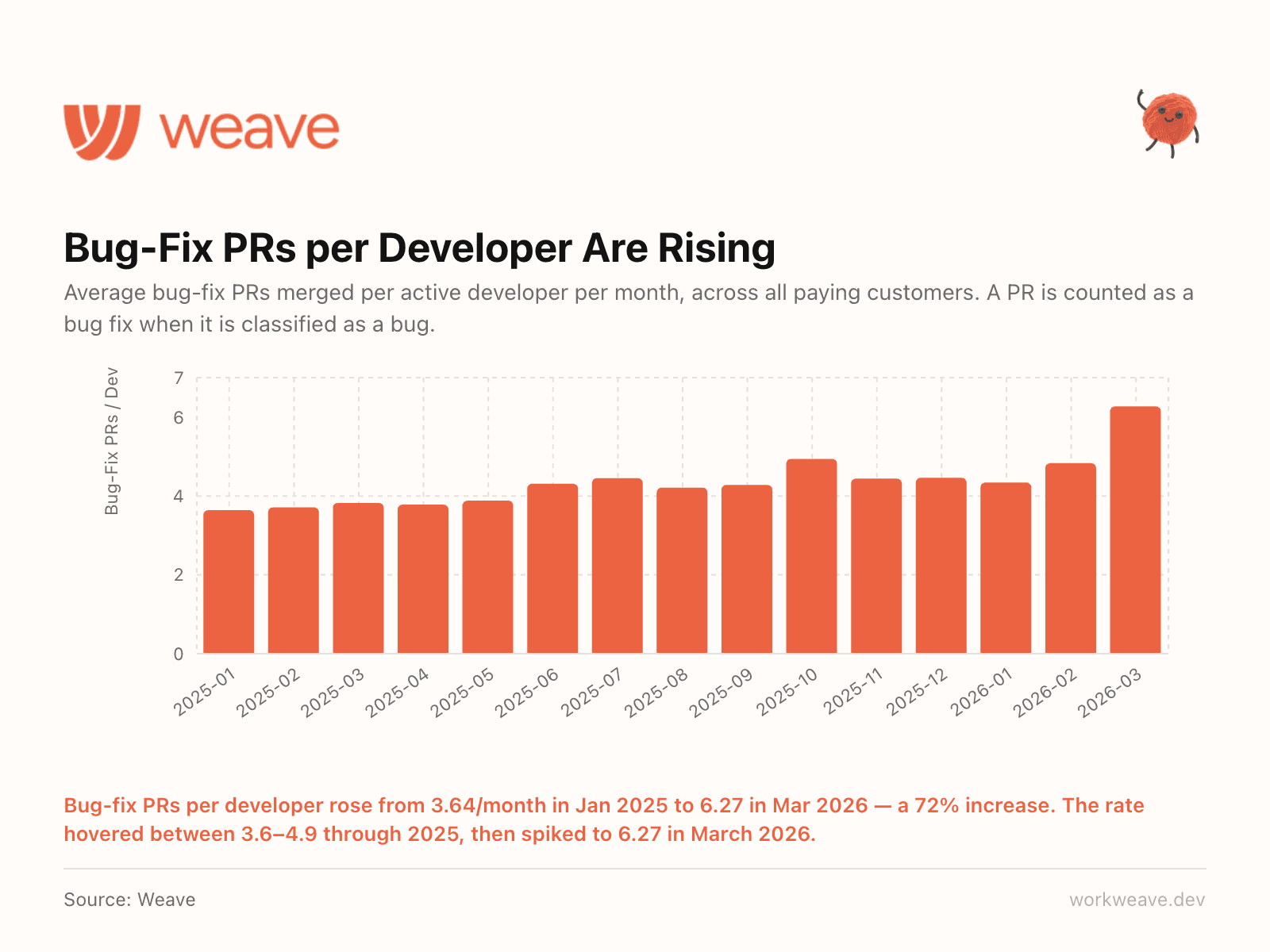 Bug-fix PRs per developer rose from 3.64/month in January 2025 to 6.27 in March 2026, a 72% increase. Through most of 2025, this number was stable at about 3.8-4.5. Then it spiked sharply in Q1 2026, right as AI-generated code surged past 40%.
